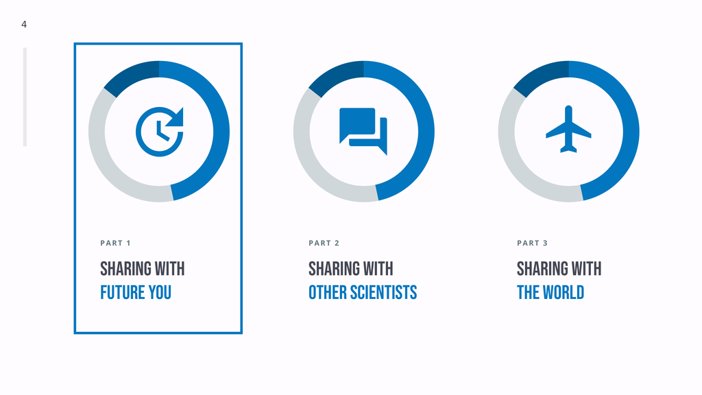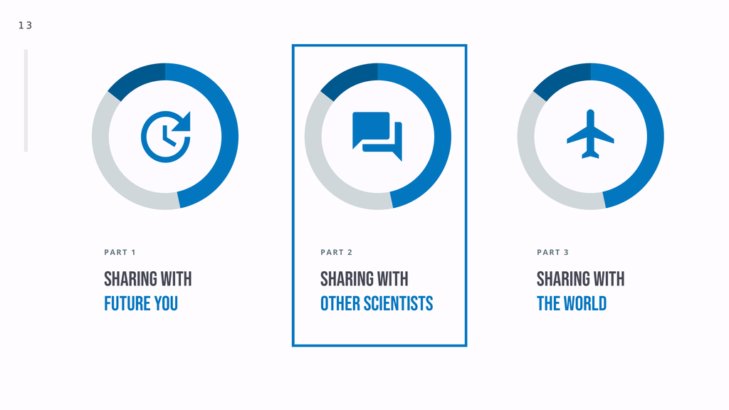 - We’ll talk first about how to share with “future you”. That means: tools and best practices for ensuring that six months from now, when a reviewer asks for some extra experiments, you don’t need to waste a week trying to even remember what your code does.