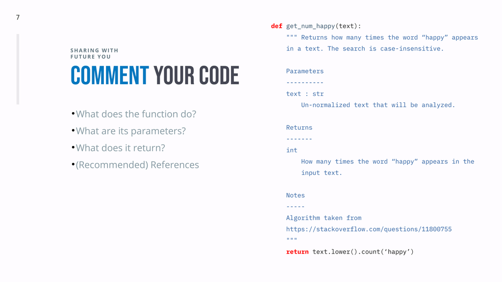 - … optionally, references. If your function implements an algorithm, writing down a link to the original paper will help you debug in the future.