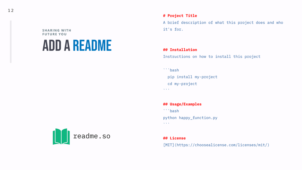 A Readme is nothing more than a text file explaining what your project does, how to install it, and how to use it. And while you probably don’t care about it at this time, plenty people will not touch your code with a 10-foot pole unless you add a license too.