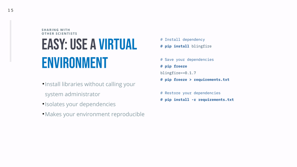 Sharing your code is then as easy as dumping your environment to a single file and adding it to your Git repository, where other users can use it to reproduce your exact environment in a matter of minutes. As a plus, it also lets you install Python dependencies without calling your system administrator every time.