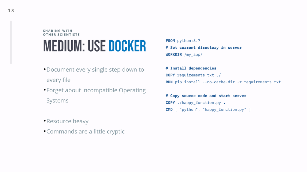 There is a fair chance that your code works on your machine and nowhere else. You almost certainly installed that one library that one time, forgot about it, and then had to spend a week retracing your steps when your computer installed an update and everything stopped working. While this may be fine for you (and it really isn’t), sharing your code with other scientists require that we raise the bar a bit. The key is ensuring that anyone can run your code at any time. I’ll quickly present three tools that you can use, from easiest to use to most powerful.