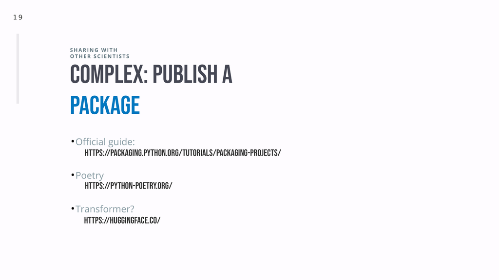 Once you’ve done this, all your users need to do to use your code is typing pip install <package> in their computers, and they are done. There is no better way to share code. This is a lot of work, though, so I won’t delve into the details here. Feel free to read either the official guide or the Poetry website. And if you are researching Transformers, consider pushing them to the Hugging Face repository.