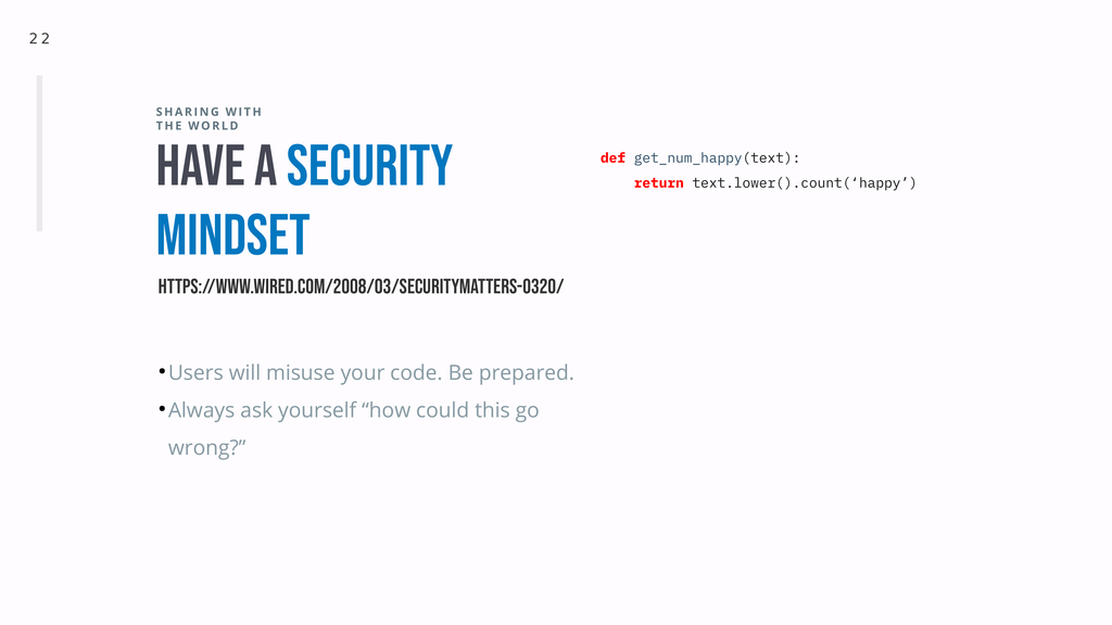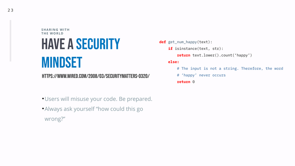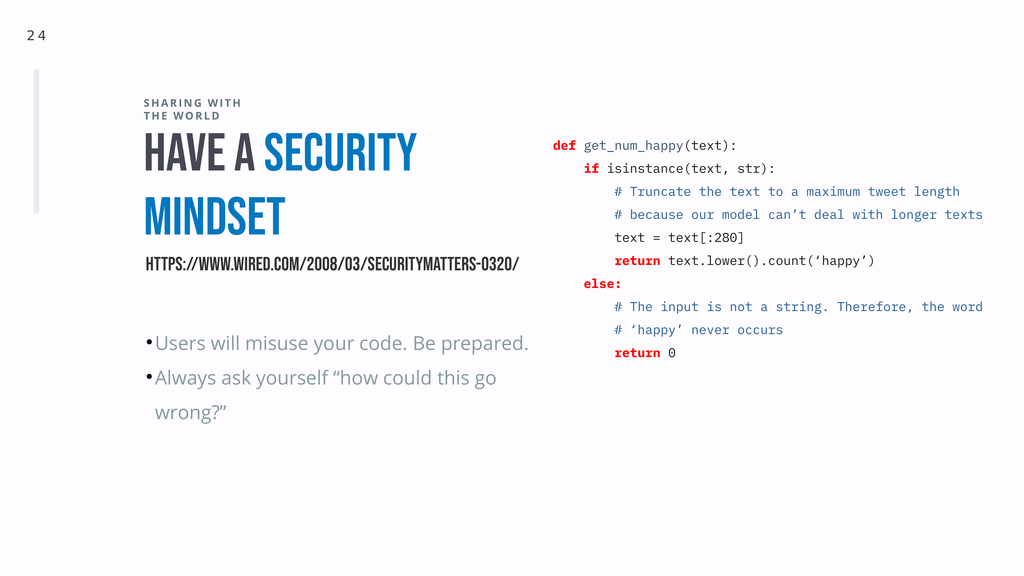 Before you release anything in the open, you should stop and ask yourself “how could this go wrong?”. This is what security expert Bruce Schneier calls having a Security Mindset: having the certainty that users will misuse your code (maliciously or not) and being prepared for it.