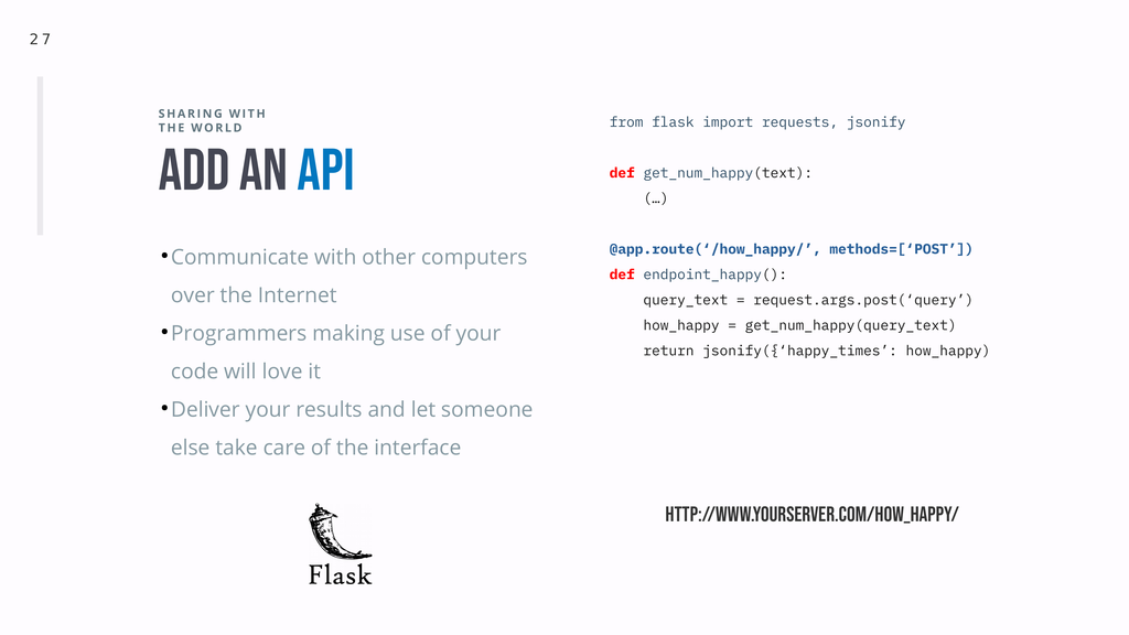Now that you are ready to share your code, you need to decide whether you want to build the interface yourself or if you’d prefer someone else to do it for you. In the later case what you need is an API, a standard interface for other computers to talk with your system. If you have existing code then your best friend is Flask, a Python library that adds a thin wrapper around your code to quickly build such an API.